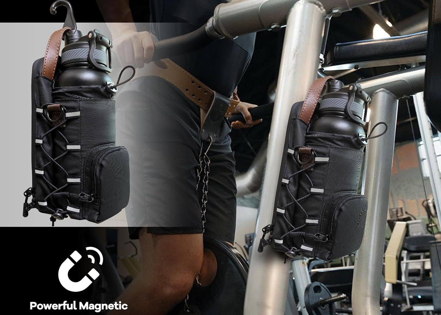 A premium gym pouch with industrial-strength magnets that securely attaches to any metal gym equipment.